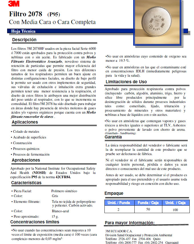 Medio filtrante que no dificulta la respiración normal. Posee clip nasal que proporciona un ajuste anatómico. Facilita el uso de anteojos o monogafas, proporcionando visión total. Claridad plena de comunicación usando el tono normal de la voz. Efectivo contra polen, polvo, pasto, recién cortado y otras partículas no tóxicas. Resistente a la humedad y a las altas temperaturas.